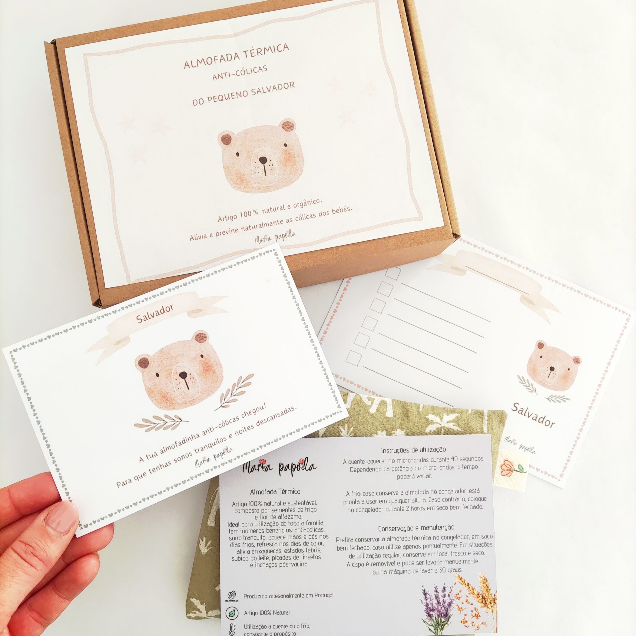 Podes dar um toque especial à tua almofada anti-cólicas adicionando a opção de personalização. Este extra inclui uma caixa de cartão com um autocolante personalizado, um cartão personalizado com o nome do bebé e um cartão para preenchimento livre. Adiciona esta opção ao carrinho de compras para que o teu presente seja único! ♥